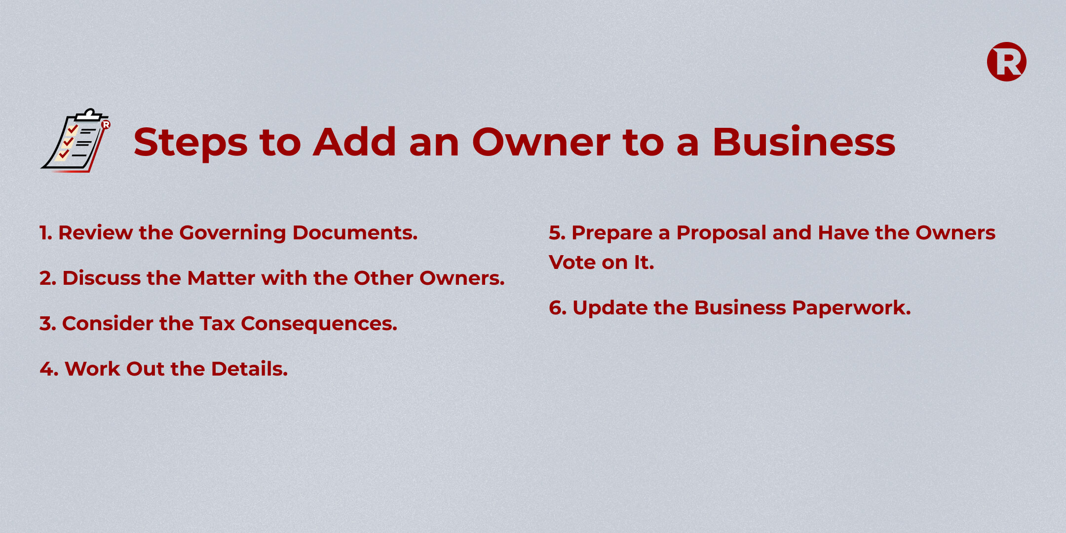 Next, prepare a proposal that outlines the new owner’s investment, equity, and role. The other owners can vote on it, following the procedures in your governing documents.
