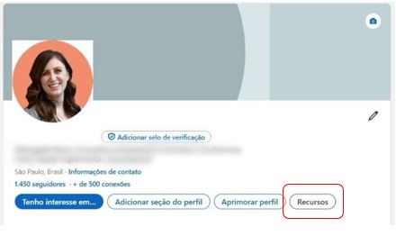 3. No seu perfil, confira se todas as informações que deseja estão preenchidas. Com a confirmação de que está do jeito de deseja, clique em "Recursos":