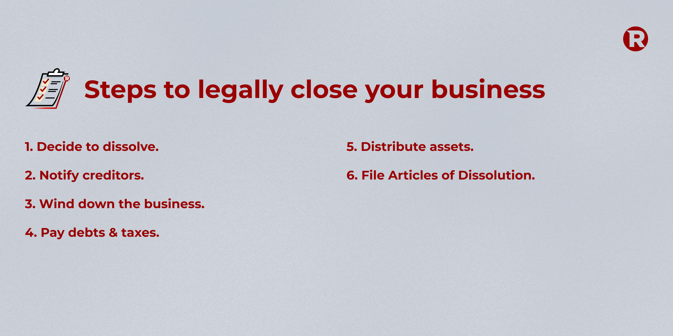 Keep in mind that once your company is dissolved, it no longer exists as a separate legal entity. This means you lose liability protection for any business-related activities going forward. For that reason, filing Articles of Dissolution should be one of the final steps when closing a company for good.