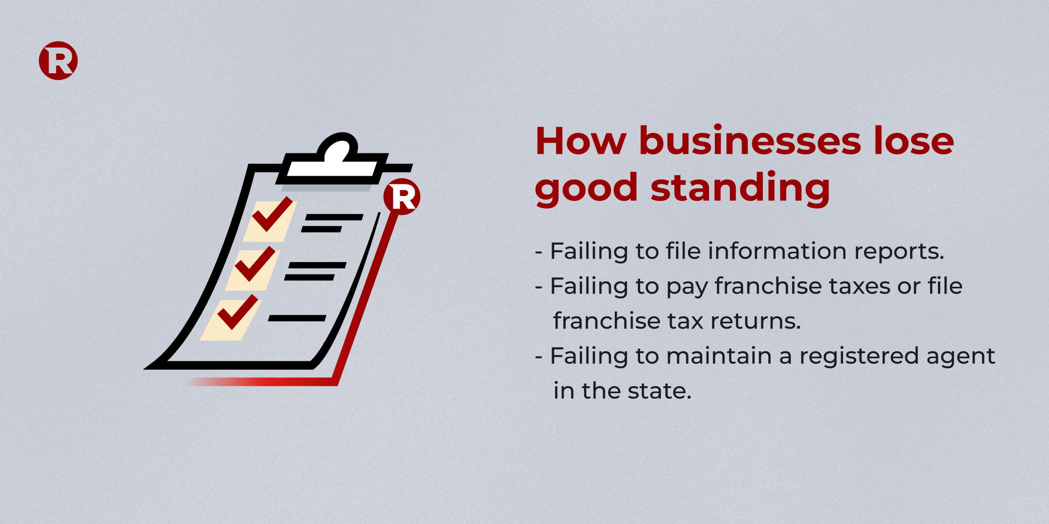 Failure to pay franchise/privilege taxes or submit the required returns can lead to a loss of good standing, which may ultimately result in administrative dissolution.