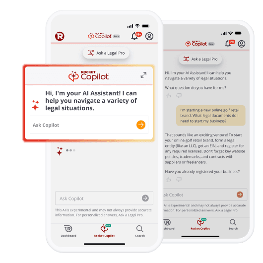 Legal surprises don’t always find you at your desk. Download the Rocket Lawyer mobile app to ask questions anytime, anywhere. Rocket Copilot is ready when you are.