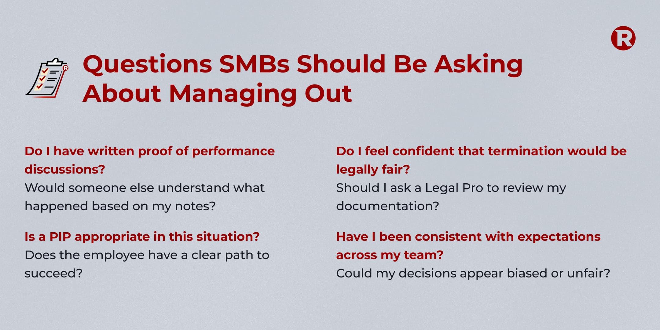 - Do I feel confident that termination—if needed—would be legally sound? Should I ask a Legal Pro to review my documentation?