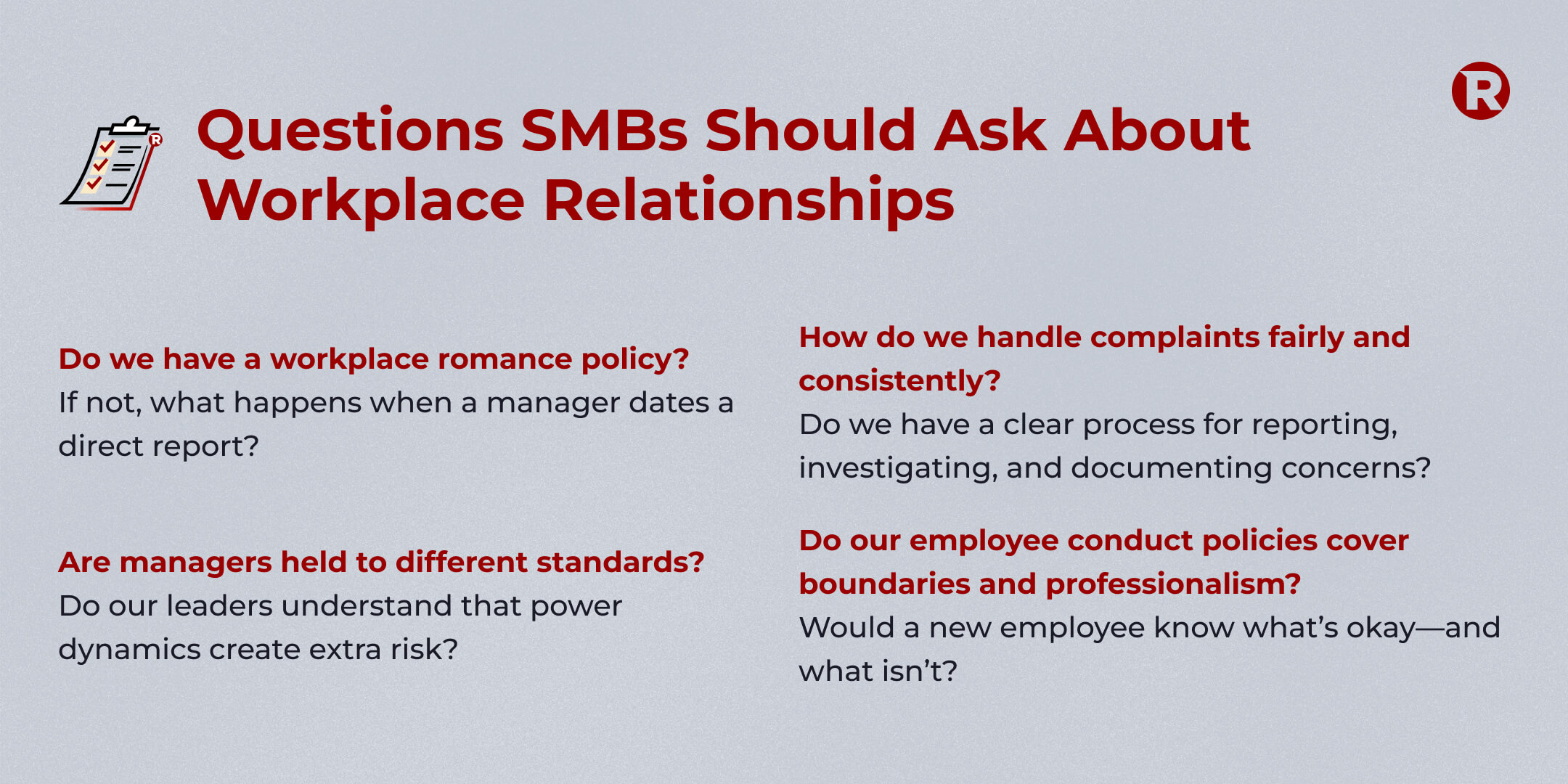 - Do our employee conduct policies cover boundaries and professionalism? Would a new employee know what’s okay—and what isn’t?