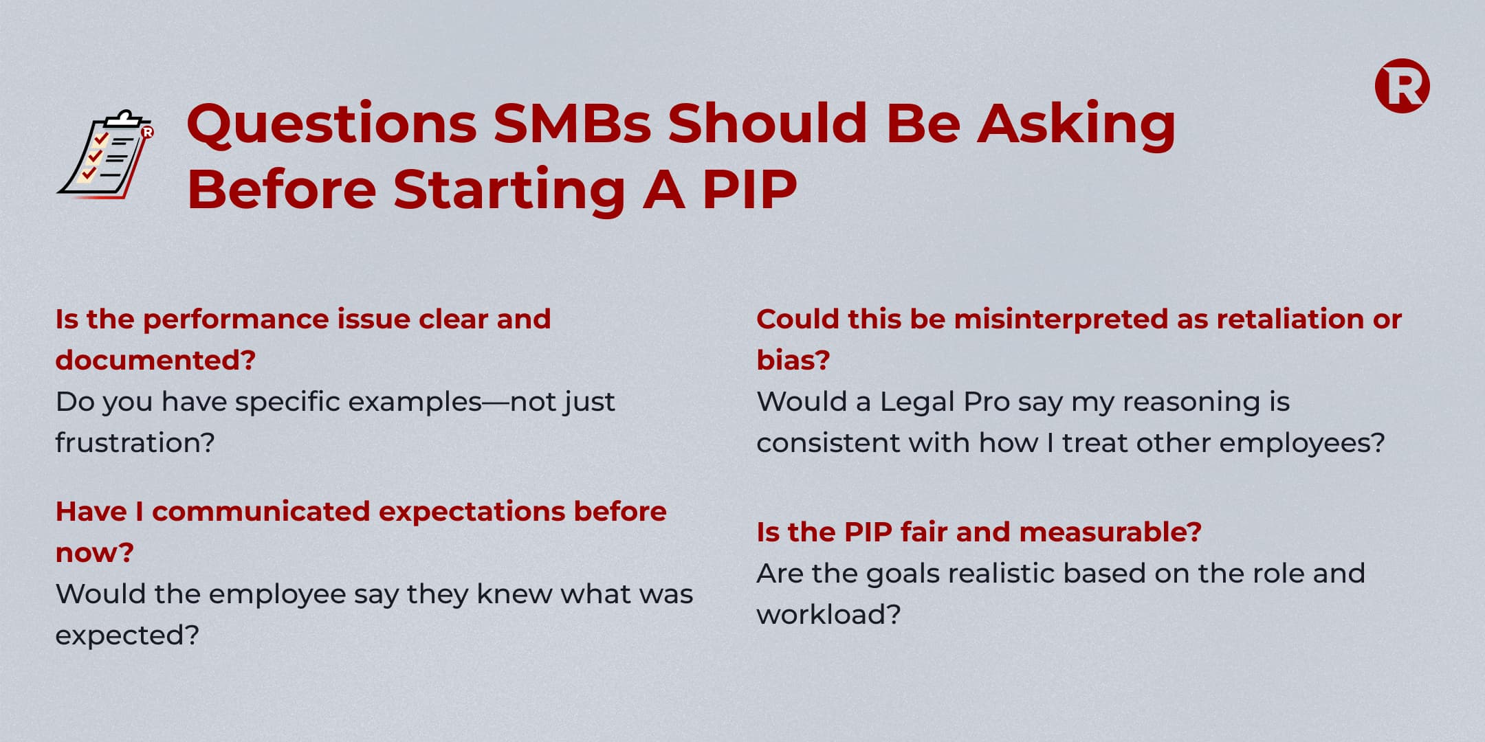 - Could this be misinterpreted as retaliation or bias? Would a Legal Pro say my reasoning is consistent with how I treat other employees?