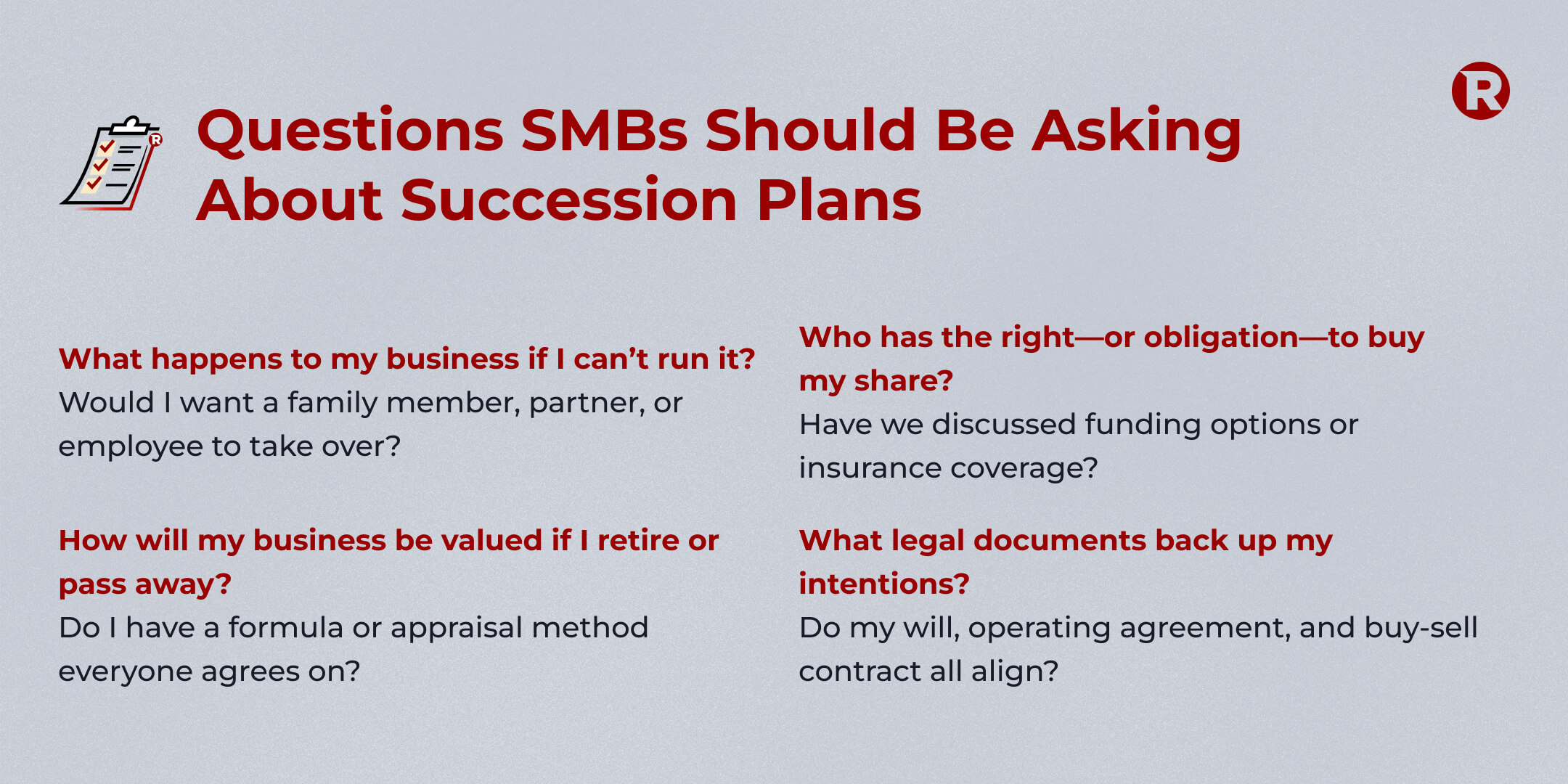 Before drafting or updating your succession plan, ask yourself a few key questions: