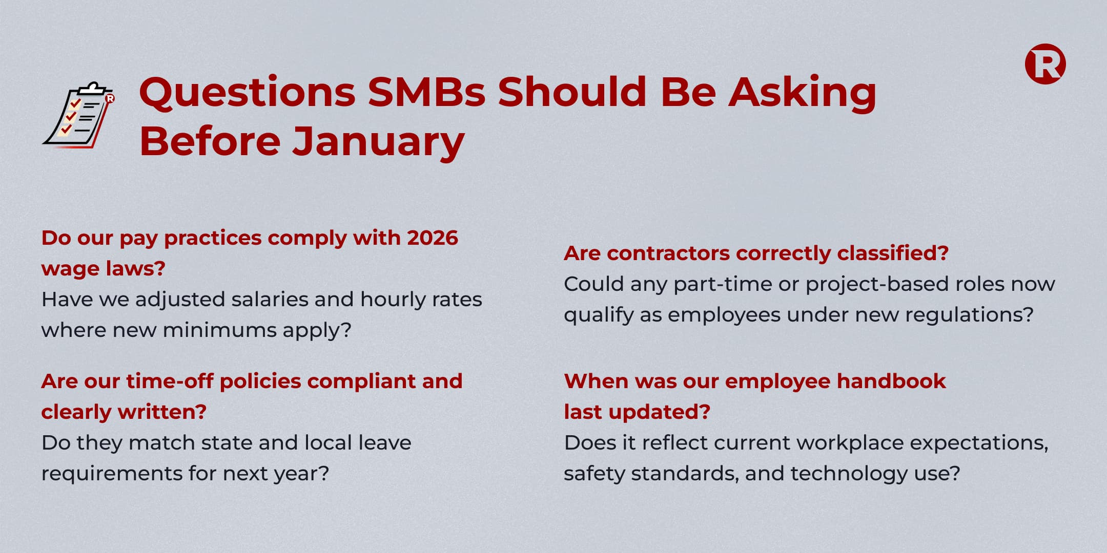 - Do our pay practices comply with 2026 wage laws? Have we adjusted salaries and hourly rates where new minimums apply?